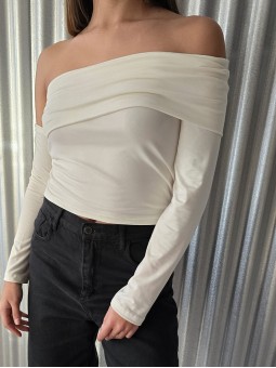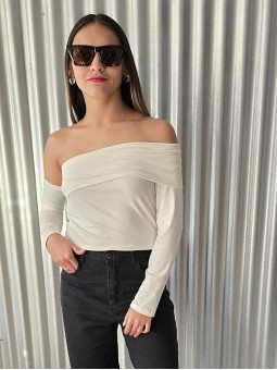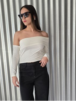 -15% OFF ABONANDO CON TRANSFERENCIA Top off shoulder de modal soft, con detalle de corte irregular en manga. * Consultá las medidas abajo en la descripción.