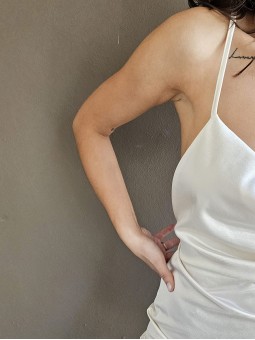 - 15% EXTRA ABONANDO CON TRANSFERENCIA Vestido de satén elastizado con escote buche y espalda cruzada. * Consultá las medidas abajo en la descripción.