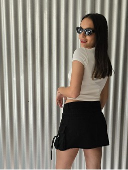 $25.000 ABONANDO EN EFECTIVO EN LOCAL $29.000 ABONANDO CON TRANSFERENCIA Mini denim rígido cargo, con bolsillos y tiras laterales. * Identificá tu talle en la tabla que figura debajo