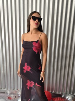 Vestido largo de microfibra, con viso corto interno y detalle de flores estampadas. * Consultá las medidas abajo en la descripción.