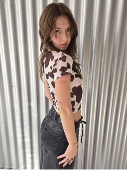$6.000 ABONANDO EN EFECTIVO EN EL LOCAL $7.000 ABONANDO CON TRANSFERENCIA Top de microtul manga corta, con estampa vaquita. * Consultá las medidas abajo en la descripción.