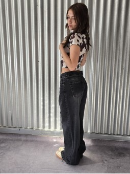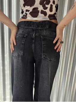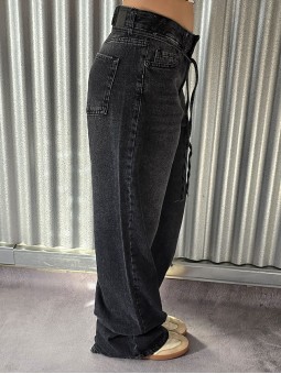 -15% OFF ABONANDO CON TRANSFERENCIA Jean wide leg recto de tiro medio con tira en cintura y lavado gastado suavizado en gris oscuro. *Identificá tu talle en la tabla que figura abajo.
