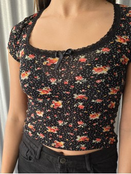 $7.000 ABONANDO EN EFECTIVO EN LOCAL $9.000 ABONANDO CON TRANSFERENCIA Remera baby tee de jersey con lycra, con estampa en delantero y puntilla en mangas. * Consultá las medidas abajo en la descripción.