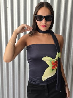 Top strapless de microfibra, con estampa lateral y lazo para atar en cuello.