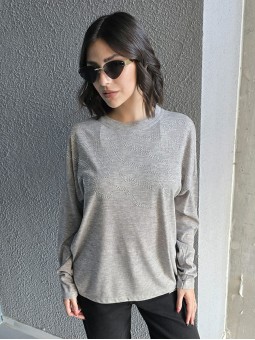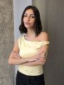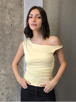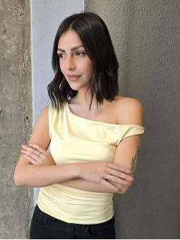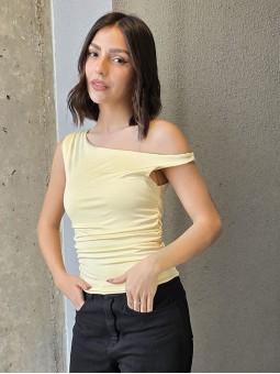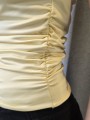 Top de microfibra satinado, escote irregular, con forrería en delantero y frunces al costado.