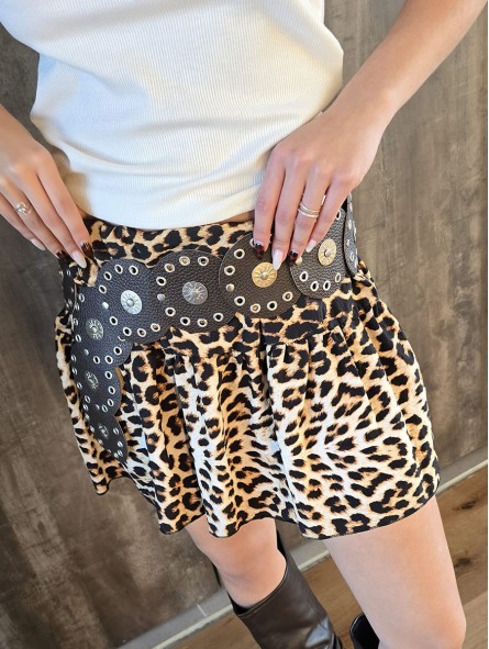 Minifalda de fibrana satinada estampada, con recorte y frunces y elástico en cintura.