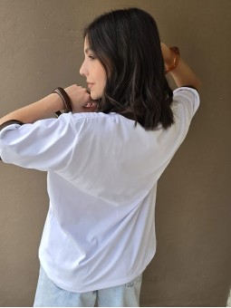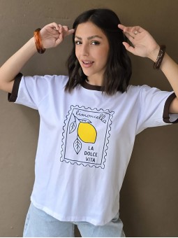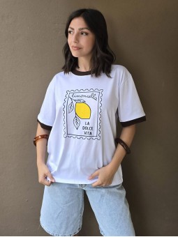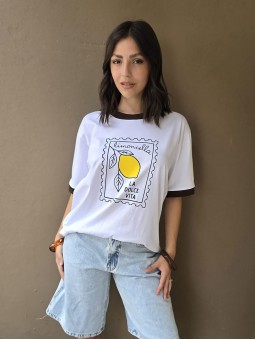 Remera de algodón con estampa delantera y vivo a contratono en cuello y mangas.