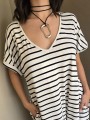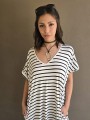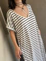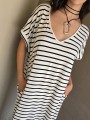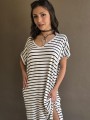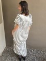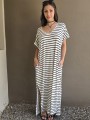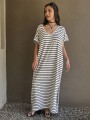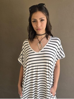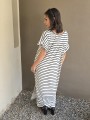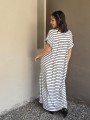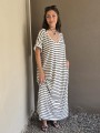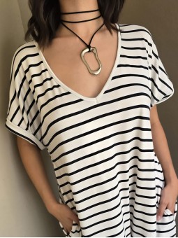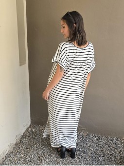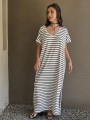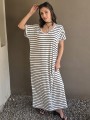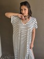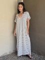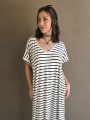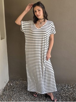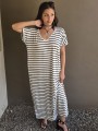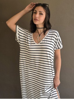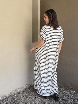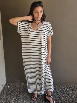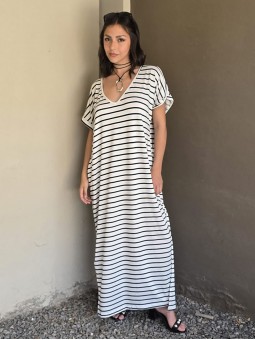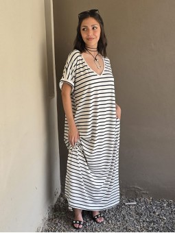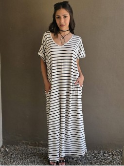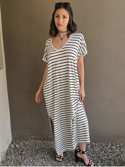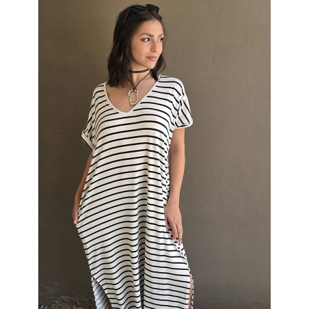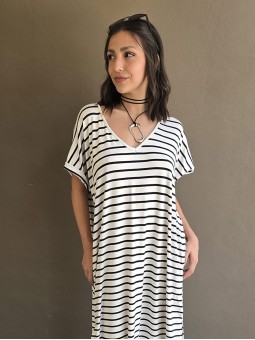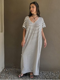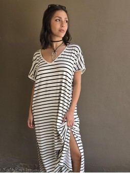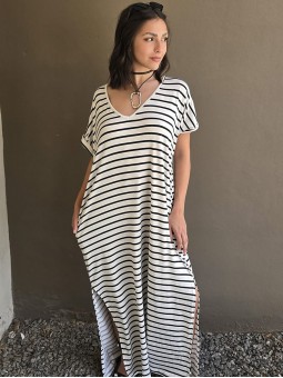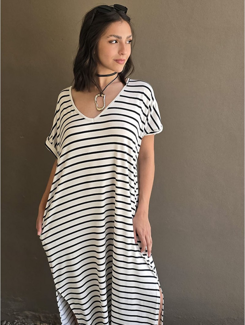 Vestido largo de modal soft, con cuello V y mangas cortas. Corte amplio, oversize, con tajos inferiores y bolsillos.