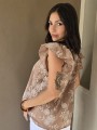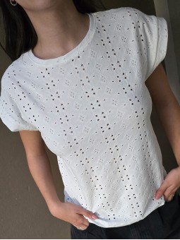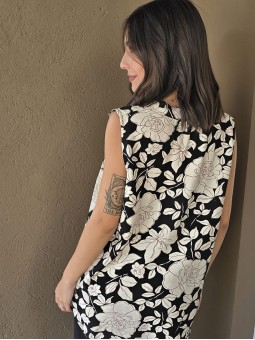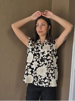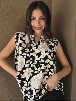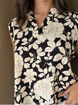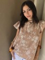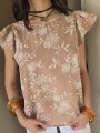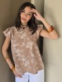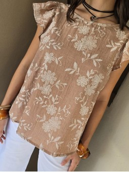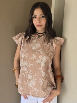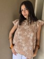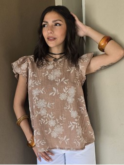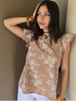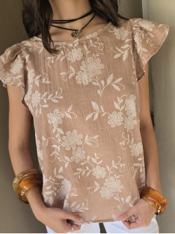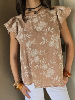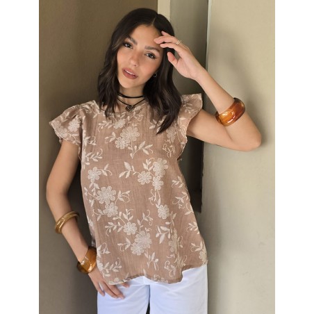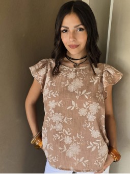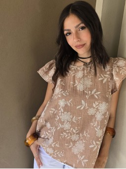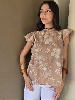 Blusa cuello a la base de lino, con flores bordadas y volados en mangas.