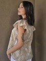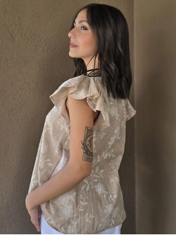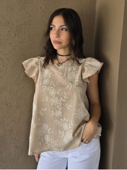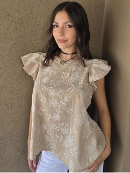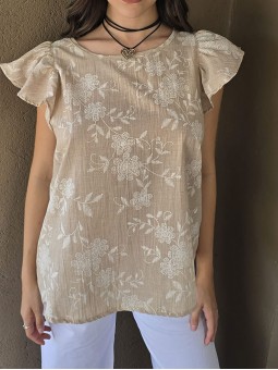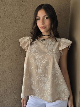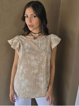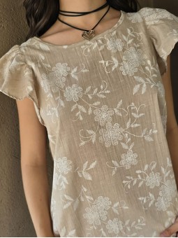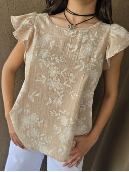 Blusa cuello a la base de lino, con flores bordadas y volados en mangas.