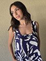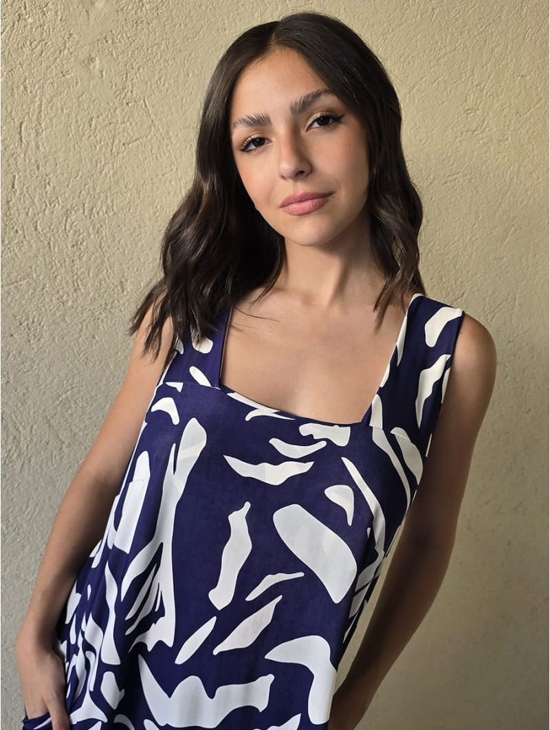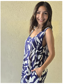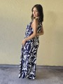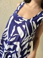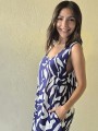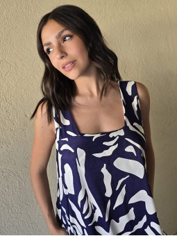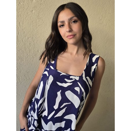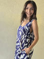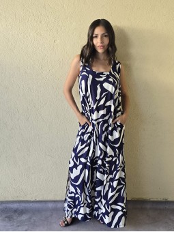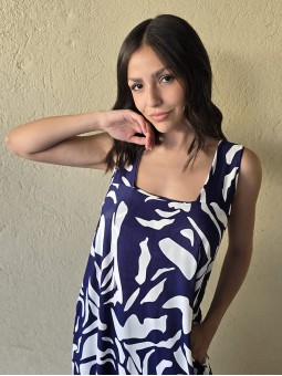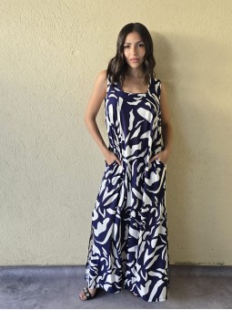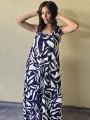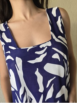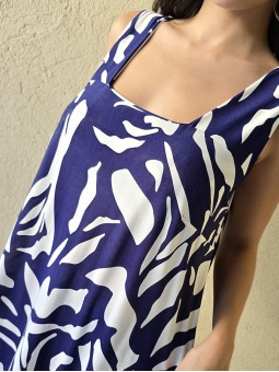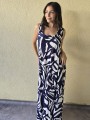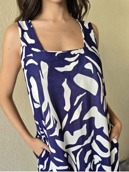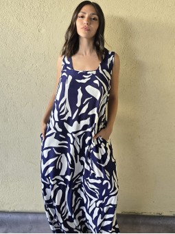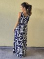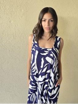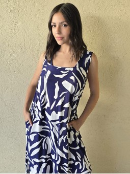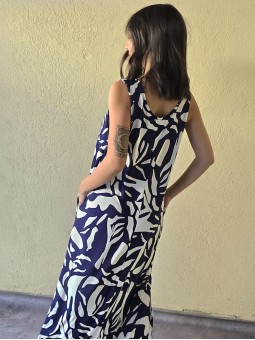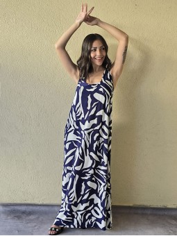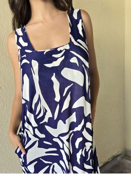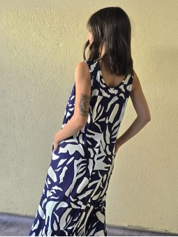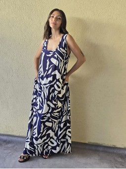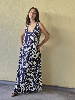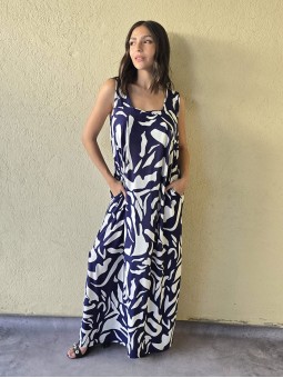 Vestido largo de seda fria estampado azul con blanco, con bolsillos y tajos inferiores laterales.