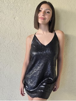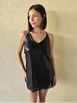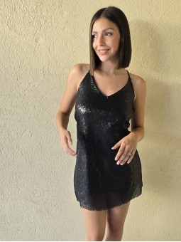 Vestido corto de micro lentejuelas opacas bordadas. Con viso interno y espalda con tiras elastizadas cruzadas.