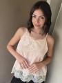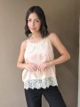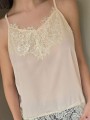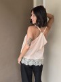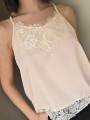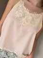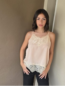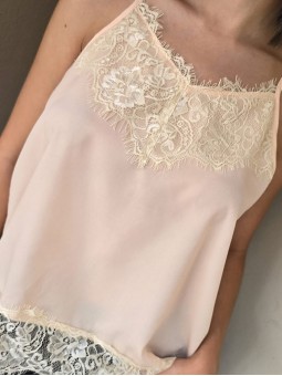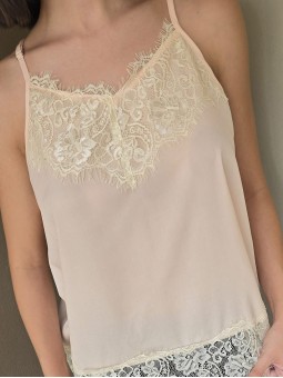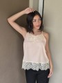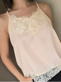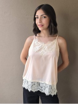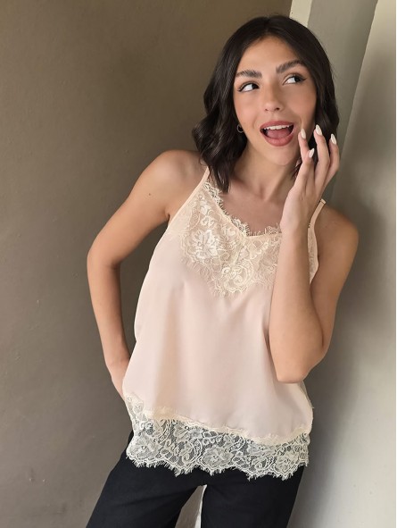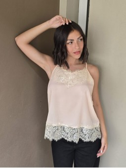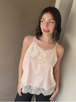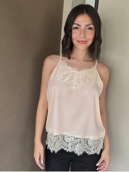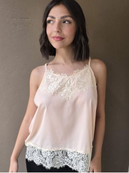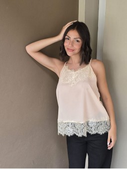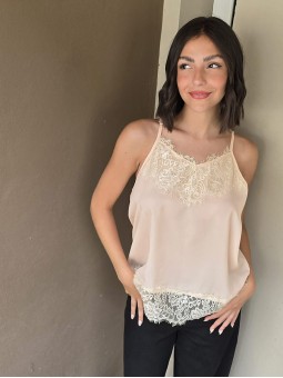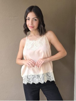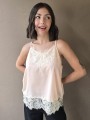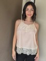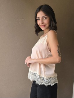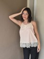 Blusa de saten opaco, con puntilla en escote y ruedo, y breteles regulables.