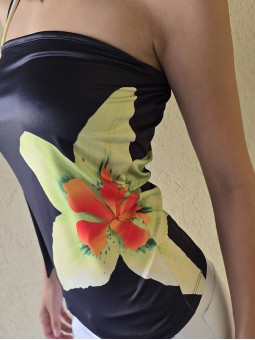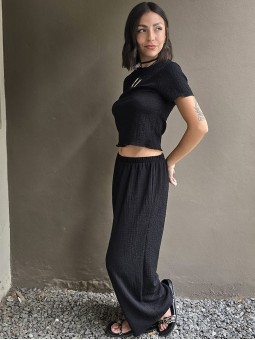 Vestido de crepe elastizado, con corte evasé y detalle de nudo en escote.