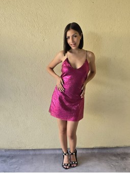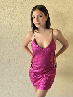 Vestido de microfibra de lurex, con arruchado en costados.