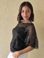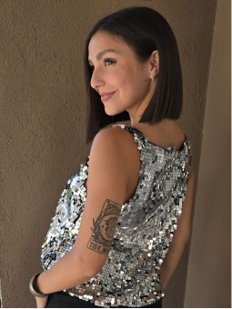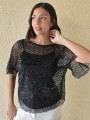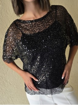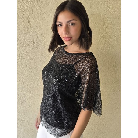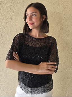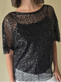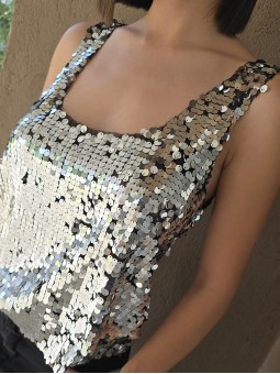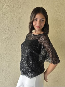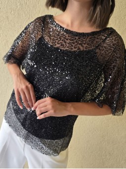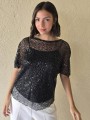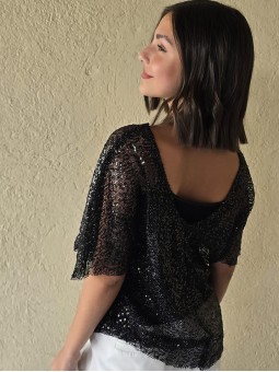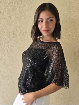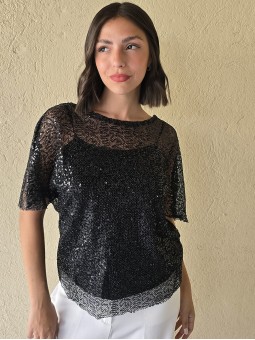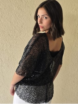 Blusa cuello a la base, de microlentejuelas plata, con escote V posterior. No incluye el top que esta debajo.