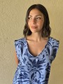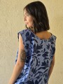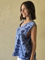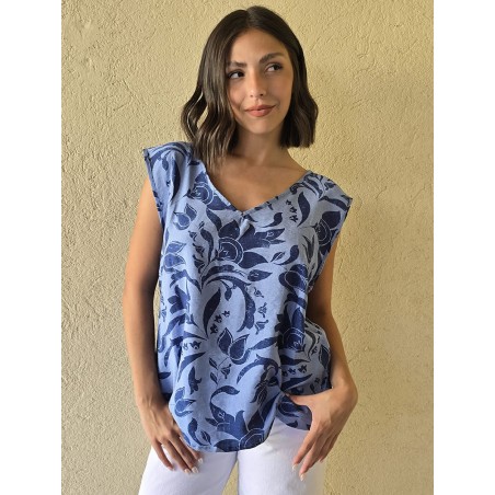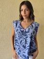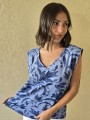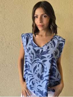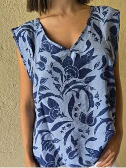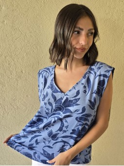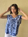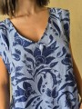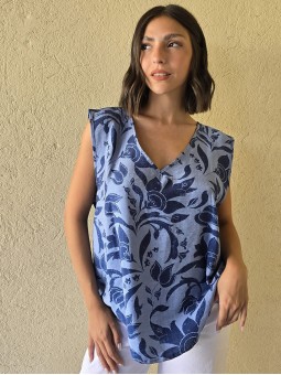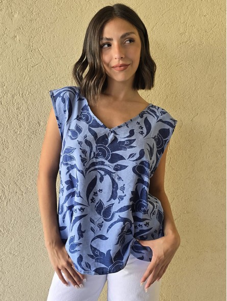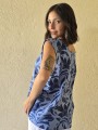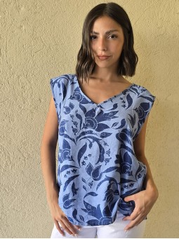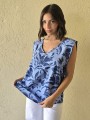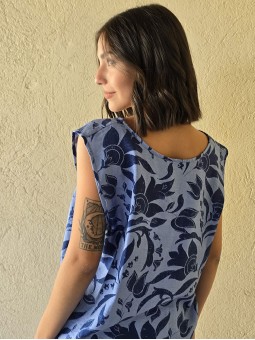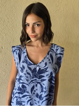 Blusa de lino con estampa en azul, con bretel ancho, corte suelto.