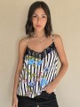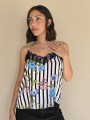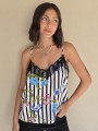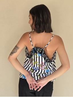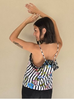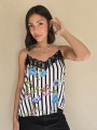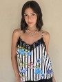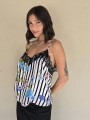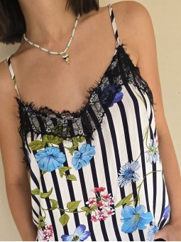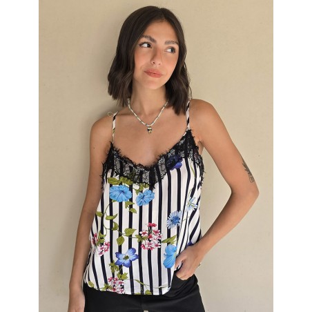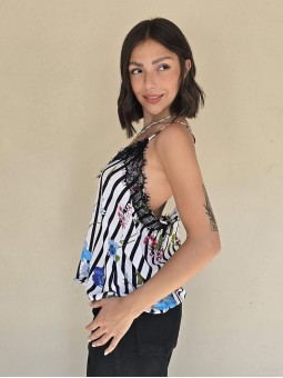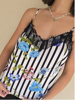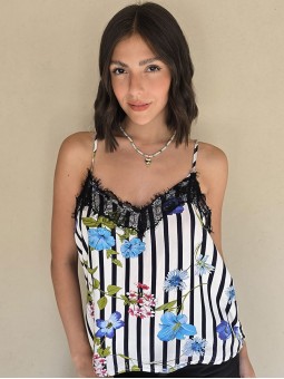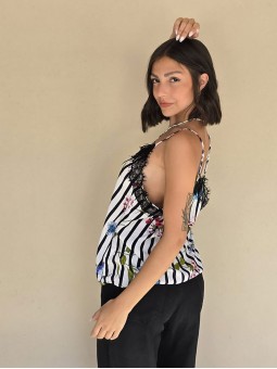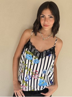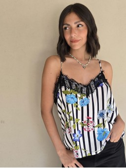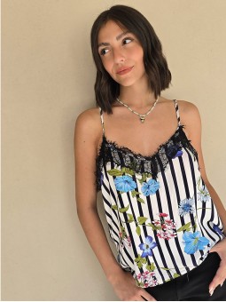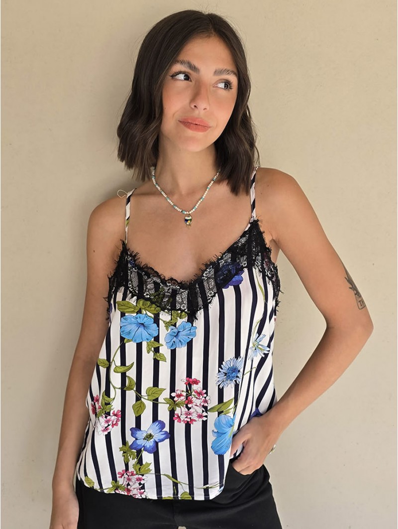Blusa de fibrana estampada con breteles finos y puntilla en el escote.