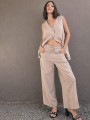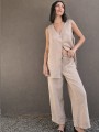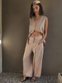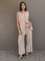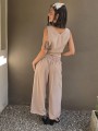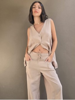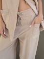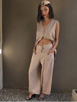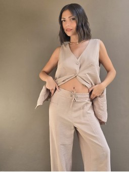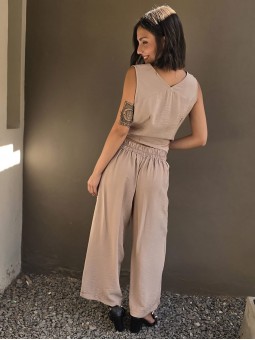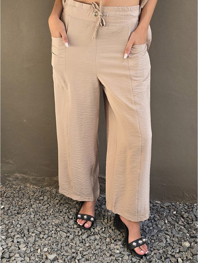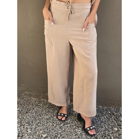 Pantalon pallazo corto (al tobillo) de seda crush, con bolsillos en delantero y cintura posterior elastizada. Cuenta con lazo delantero para regular.
