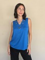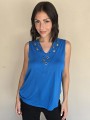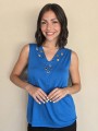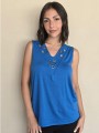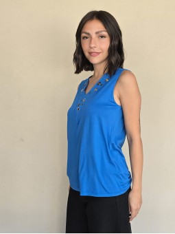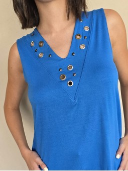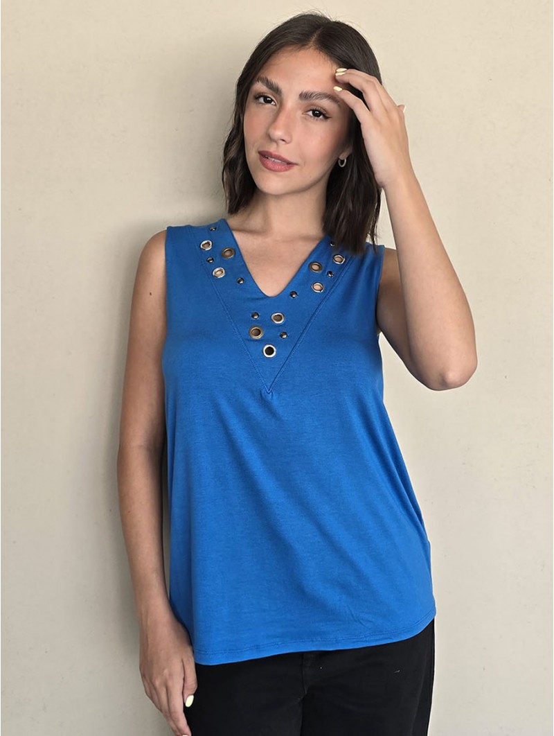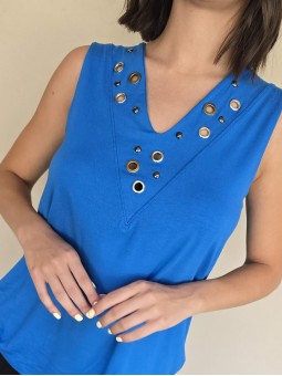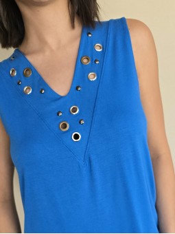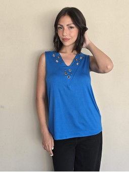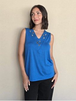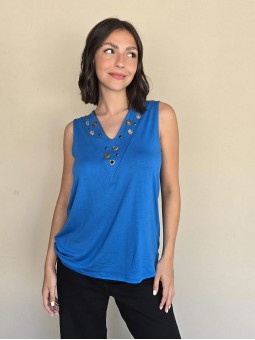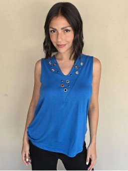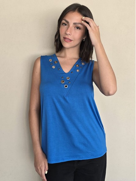 Musculosa de modal viscosa escote V con ojalillos y tachas en delantero.
